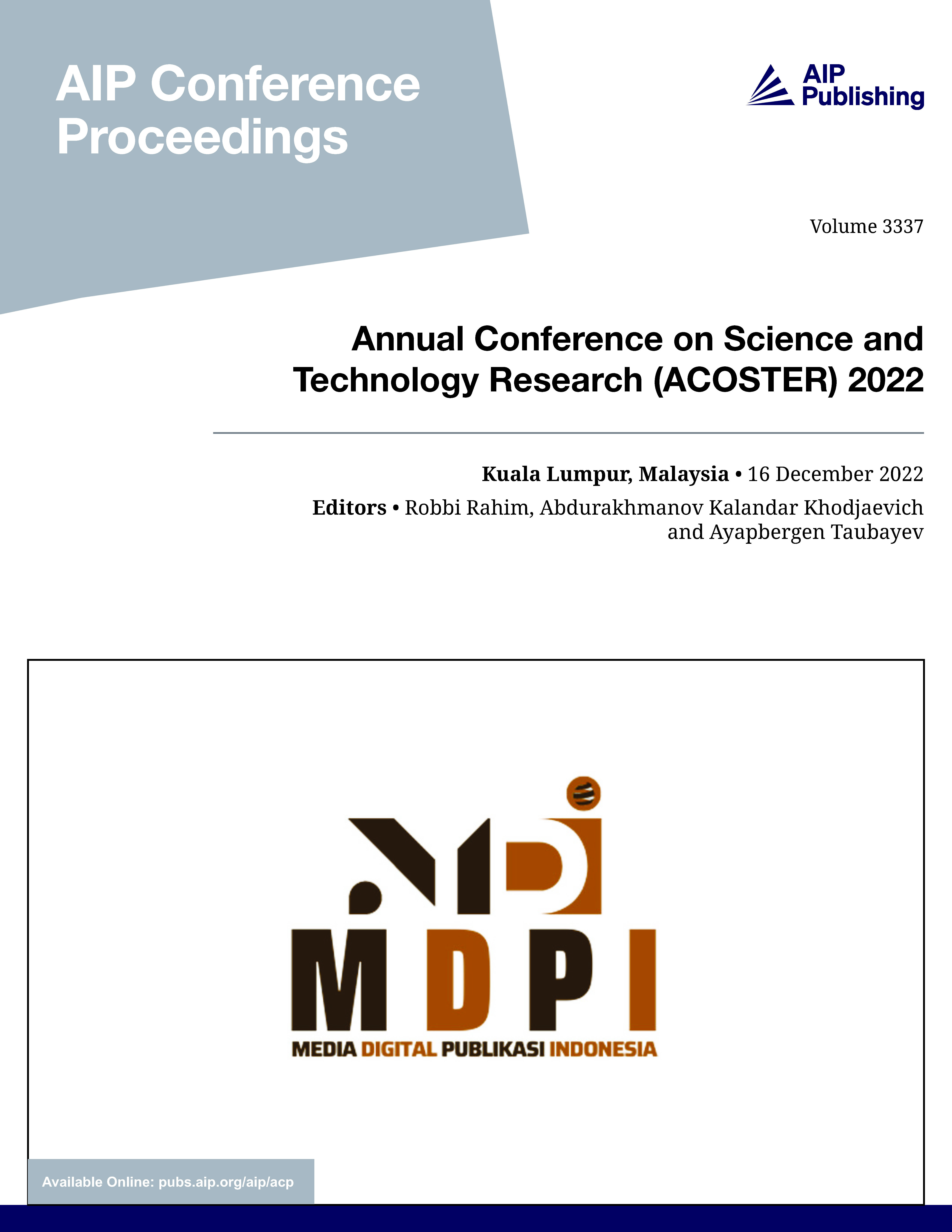 Volume 3337 is the proceedings of Annual Conference on Science and Technology Research (ACOSTER) 2022 (44911, Malaysia, Indonesia)